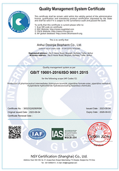Other Competitive Advantages: Dexinjia Pharma includes Anhui Dexinjia Biopharm Co., Ltd., Anhui Denuo Pharmaceutical Co., Ltd. and Jinan Dexinjia Bio&Tech Co., Ltd.. It is a continuously innovative High-tech Enterprise specializing in the R&D, production and sales of Pharmaceutical raw materials and intermediates. Factories are located in Anhui Taihe Pharmaceutical Park, covering an area of over 200000m2. Companies have five R&D platforms, such as Provincial Key Lab, EC and ETC etc.. It is an Provincial Innovation Demonstration Enterprise and has R&D centers established in Jinan, Hefei and Fuyang. The production workshops with high standards and supporting facilities can simultaneously meet reaction conditions such as low temperature, ultra-low temperature, high temperature and high pressure etc.. More than 420 sets of various reaction kettles can meet annual production capacity of over thousand tons. Various raw material warehouses and finished product warehouses meet different products storage conditions. Company passed the GB/T24001-2016/ ISO14001: 2015 and the GB/T45001-2020/ ISO45001: 2018. Comprehensive analysis equipment values nearly 70 million yuan. It has strict quality management processes and passed the GB/T19001-2016/ ISO9001: 2015. DEXINJIA is looking forward to sincere cooperation with you. Warmly welcome domestic and foreign customers to our company for inspection, visit and audit.